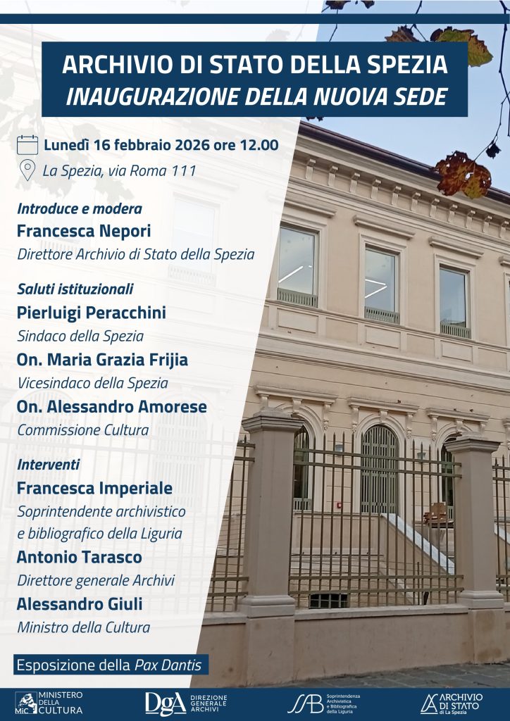 Lunedì 16 febbraio alle ore 12 sarà inaugurata la nuova sede dell’Archivio di Stato della Spezia, in via Roma 111.